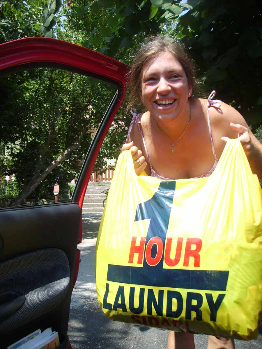Wäsche waschen in Sidari („1 Hour Laundry“). Irgendwann muss es sein. Eigentlich kamen wir nur auf diese Idee, weil unser Campingplatz leider mit keiner Waschmaschine ausgestattet war… es war eine wirklich gute Idee. Uns kamen 10 EUR für einen Korb Wäsche etwas teuer vor, ABER: Die Wäsche war nach einer Stunde trocken, gut riechend und zusammengelegt – und zwar von einem jungen, netten Mann, der sichtlich Freude an seiner Arbeit zu haben schien. Katharina hatte auch nicht damit gerechnet, dass alles faltenfrei und zusammengelegt sein würde, deshalb hatten wir richtigen Spaß, als wir die Wäsche abholten ;)