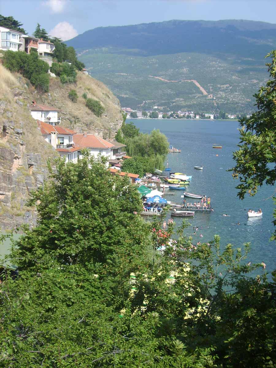 Überraschung am Morgen: Wir hatten das Zelt in der Finsternis so aufgestellt, dass ein belgisches Paar nicht mit ihrem Wohnwagen ausfahren konnte. Also tauschten wir die Plätze, begossen diesen Deal mit Slibowitz und badeten noch eine Weile am Strand des Ohrid Sees.